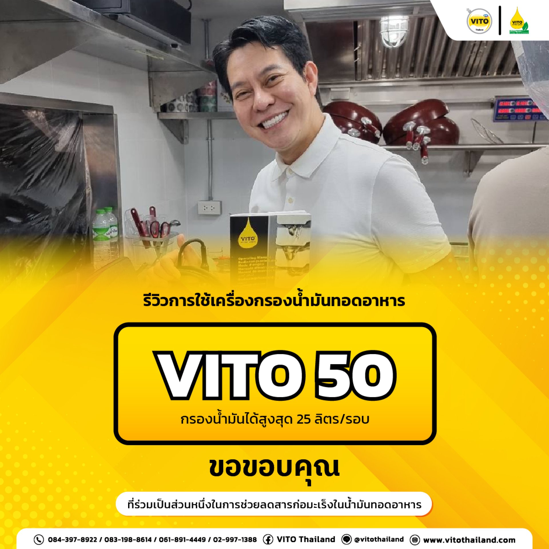 ขอขอบพระคุณคุณลูกค้า ที่เลือกใช้เครื่องกรองน้ำมันทอดอาหาร "VITO 50" เลือกใช้ VITO เพื่อเป็นส่วนหนึ่งในการช่วยลดสารก่อมะเร็งในน้ำมันทอดอาหาร