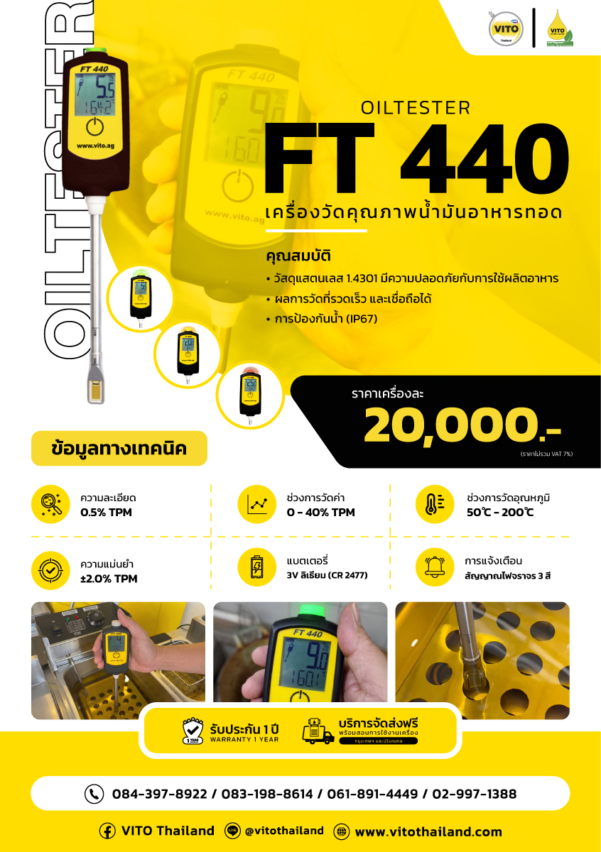 เครื่องวัดคุณภาพน้ำมันทอดอาหาร (Oiltester) FT440 ที่จะช่วยวัดคุณภาพของน้ำมันทอดอาหารที่ใช้ โดยตัวเครื่องจะบอกเป็นค่าโพลาร์ (TPM%) จะแสดงค่าและไฟสีแสดงสถานะที่วัดได้ตรงส่วนบนของตัวเครื่อง และเห็นถึงคุณภาพน้ำมันว่าคุณภาพยังดีหรือไม่